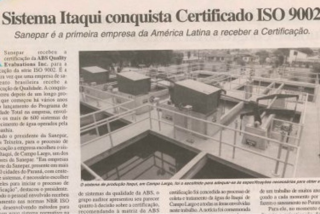 A Sanepar é a primeira empresa de saneamento da América Latina a receber a certificação NBR ISO 9002:1994 para um sistema produtor de água, a Unidade de Produção Itaqui, em Campo Largo.