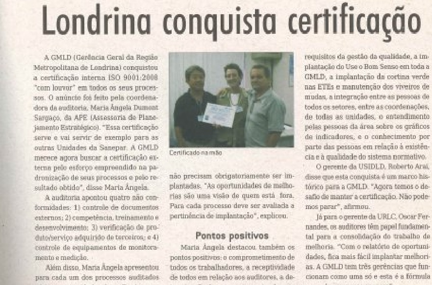 Ampliação do escopo de Campo Largo para a Unidade Regional de Londrina Cambé (URLC) e Unidade de Serviço Industrial de Londrina (USID-LD) pela ABNT NBR ISO 9001:2008.